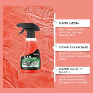 Our automotive interior cleaner contains disodium EDTA, sodium bicarbonate, and laureth-7. It removes dirt, grease, grime, and other contaminants from exterior surfaces without leaving residues or streaks. The usage is simple: 1. First rinse and dry the vehicle. 2. Apply an appropriate amount evenly to the interior surfaces of the car. 3. Clean with water or wipe with a clean cloth. It keeps the interior surfaces of your car permanently shiny, making your vehicle look brand new.