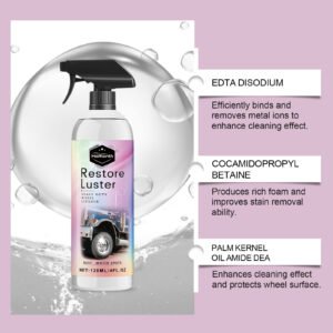 Our heavy-duty wheel cleaner contains EDTA disodium and cocamidopropyl betaine. It is suitable for all types of wheels and braking systems, including polished aluminum, matte black, and chrome surfaces. The usage method is simple: ensure the cleaning surface is free of impurities and shake well before use. Spray a small amount multiple times on the tire surface, use a sponge or brush to remove surface dirt, and rinse with water. It can also prevent tire aging and cracking, easily maintaining their appearance and durability.