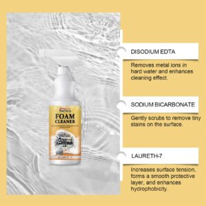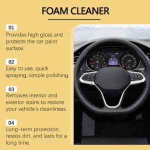 Our multipurpose foam cleaner contains disodium EDTA, sodium bicarbonate, and laureth-7. It can form a protective layer on the surface to effectively repel water and dirt, keeping your car clean. The usage is simple: 1. Shake the bottle well and evenly spray onto the surface to be cleaned. 2. Wipe with a sponge until stains are removed. It can maintain the shine of the car surface for a long time, making your car look brand new.