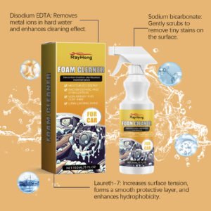 Our car multi-purpose foam cleaner contains laureth-7 and sodium laureth sulfate. It can enhance durability, resist harsh weather, and extend the service life of car paint. Its usage method is very simple: shake the bottle, spray evenly on the surface to be cleaned, and wipe with a sponge until the stains are removed. Additionally, it can reduce the adhesion of pollutants and keep the car body clean.